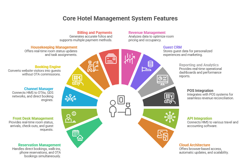 A full HMS bundles the PMS with a booking engine, channel manager, CRM, point-of-sale (POS), revenue management tools, and — critically for travel technology businesses — API integrations with OTAs, GDS networks, and third-party distribution platforms.