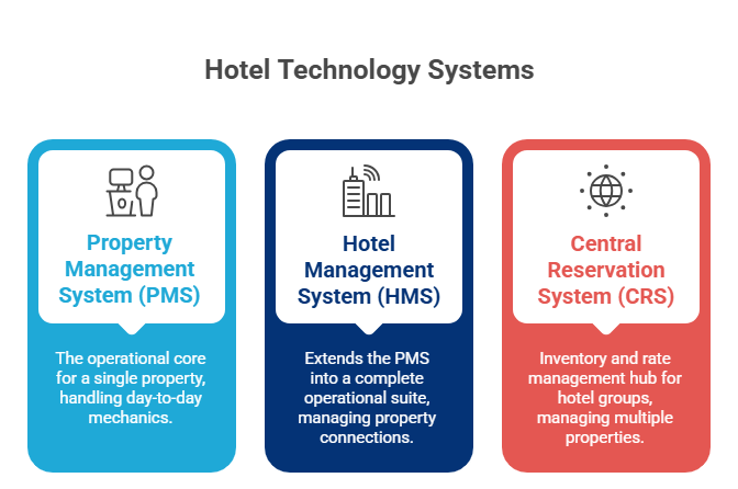 These three systems sit at different levels of your hotel's technology stack, each with a distinct scope of responsibility.